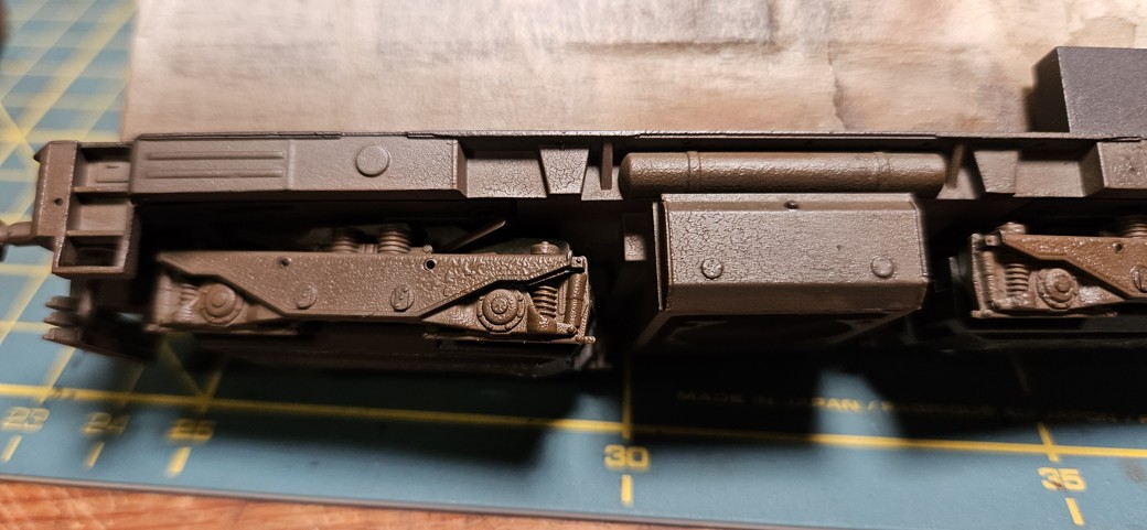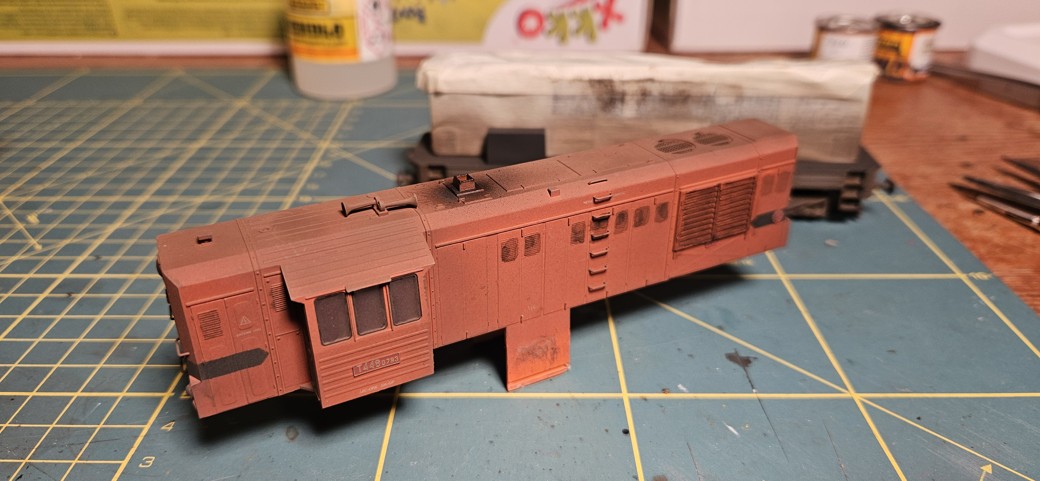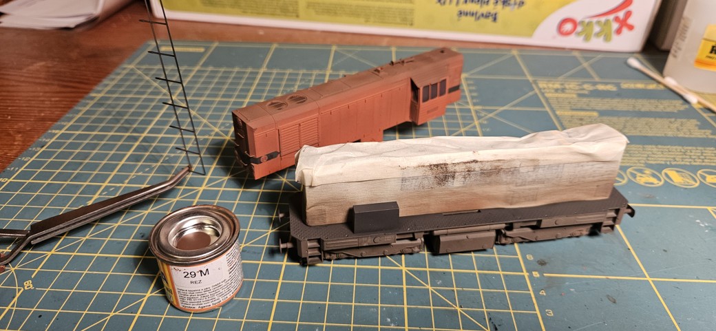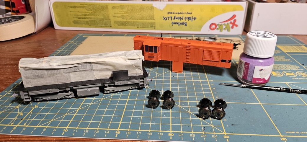 Záměrem byla mírná provozní patina, bez výrazných skrvn a stékanců. Na nástřik jsem použil syntetiku Agama N15M. Tyto barvy se netěší moc dobré pověsti a byť jsem začátečník, tak musím potvrdit, že nejsou nic moc. Nastříkal jsem skříň, pojezd a kola. Ty jsem hned otřel technickým benzínem v místech styku s kolejemi. Následně jsem to nechal týden uschnout.