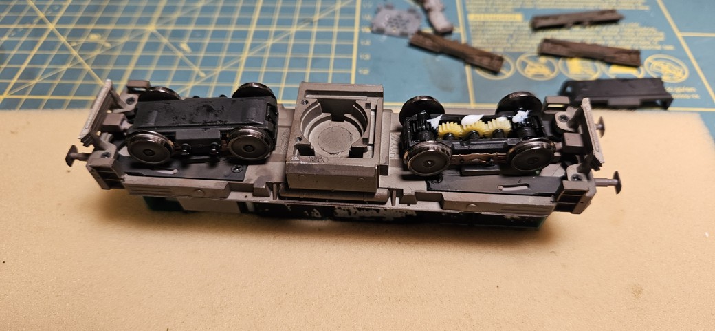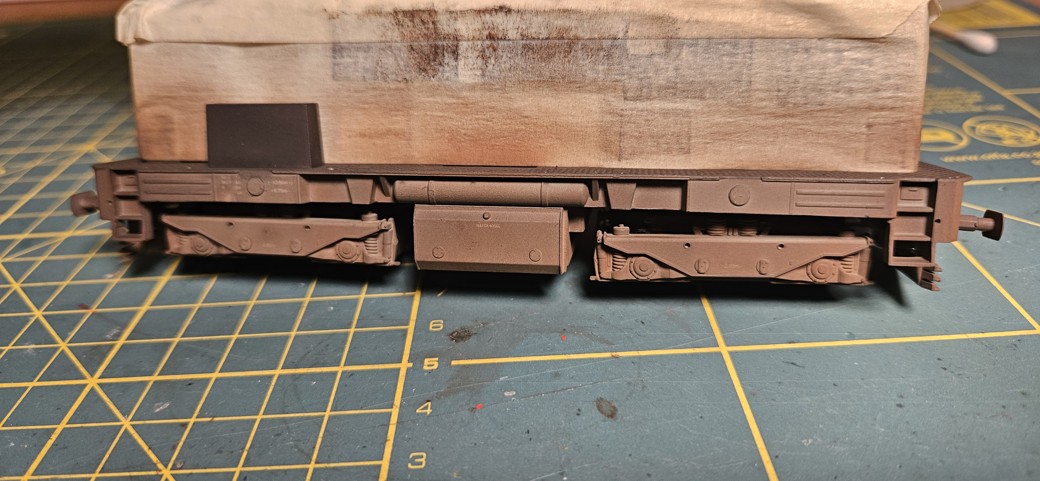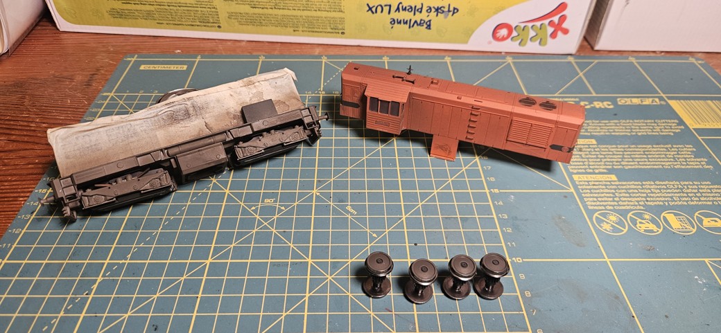 Následovala sborka, při které jsem rovnou navazelínoval ozubená kolečka. Ale po postavení na kolejiště nastal třetí problém. Byť jsem po nástřiku dvojkolí obruče otřel, při stříkání modelu jsem zjevně nastříkal i sběrné plíšky a model vůbec nechtěl jet. Musel jsem ho tedy znovu rozebrat a pracně čistit. Doporučuji tomu předcházet.